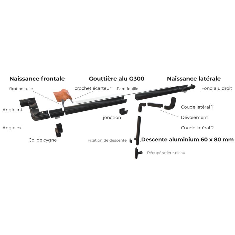 La naissance latérale Aluminium Ardoise permet une descente dite "latérale" (descente sur le coté de la maison, sur le pignon). La naissance latérale Aluminium sur la gouttière aluminium G 300 sans jonction ! On y relie 2 coudes latéraux pour permettre l'évacuation de l'eau. La naissance... La naissance...